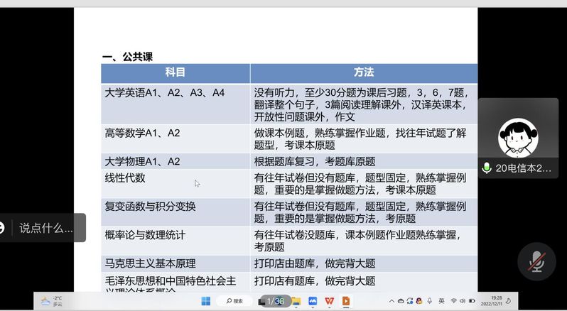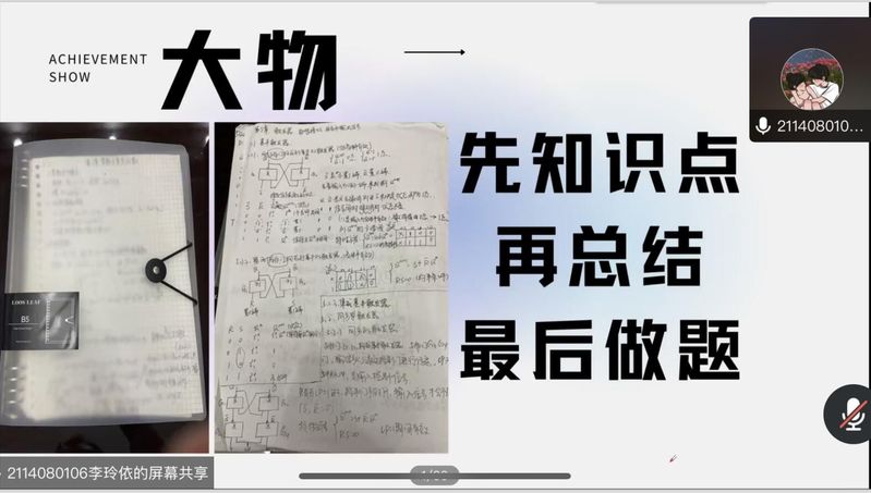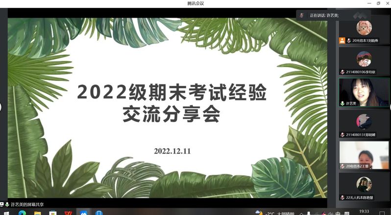 会上,4名高年级优秀学生精心准备了课件,并结合个人实际为大家提供了许多经验干货。省政府奖学金获得者刘晓燕从各科目复习准备到严肃考风考纪,用自身经历和校规校纪为临考的大一同学传授经验、敲响警钟;李玲依利用问题启发式导入引发思考,对目前疫情防控状态下线上考试进行分析,引导大一新生面对疫情科学调整心态,并展示自己的学习笔记,贴心地提供了大英、大物等学科的备考指南;郑明媛展示了自己所在宿舍各舍友的获奖证书,用实力展现了该宿舍互帮互助、共同进步的优秀宿舍文化,表示营造浓厚的宿舍学习氛围是提升学习成绩的关键因素;国家奖学金获得者王蕾从各个学科逐一精准分析,并说明了考试的流程和方式,为大一新生的今后的考试实战提供了现场感。最后,辅导员老师邀请各位经验分享的学姐进行答疑解惑,大一同学踊跃提问发言,针对期末考试形式、补考重修以及学分研修等各方面问题进行了点对点咨询。随着学姐们的耐心讲解回答,大一同学的声声道谢,这场学习经验交流分享会圆满落下帷幕。