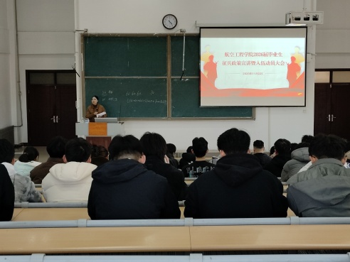 为积极响应国家号召,鼓励优秀青年学生投身国防事业,11月2日晚,航空工程学院分层次、有重点地组织各年级开展征兵政策宣讲会暨入伍动员会,各年级辅导员主持会议,全体学生参加了会议。